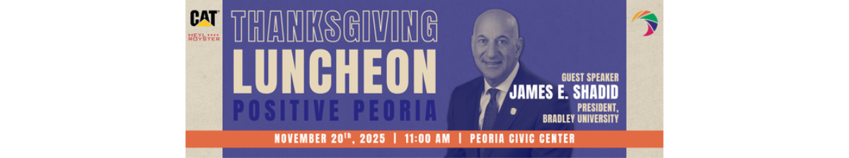 Celebrate a Positive Peoria at our annual Thanksgiving Luncheon, featuring James E. Shadid, President of Bradley University, as keynote. Recognizing today’s wins—investing in tomorrow’s impact. Join business and civic leaders for an uplifting look at progress and what’s next for our region.